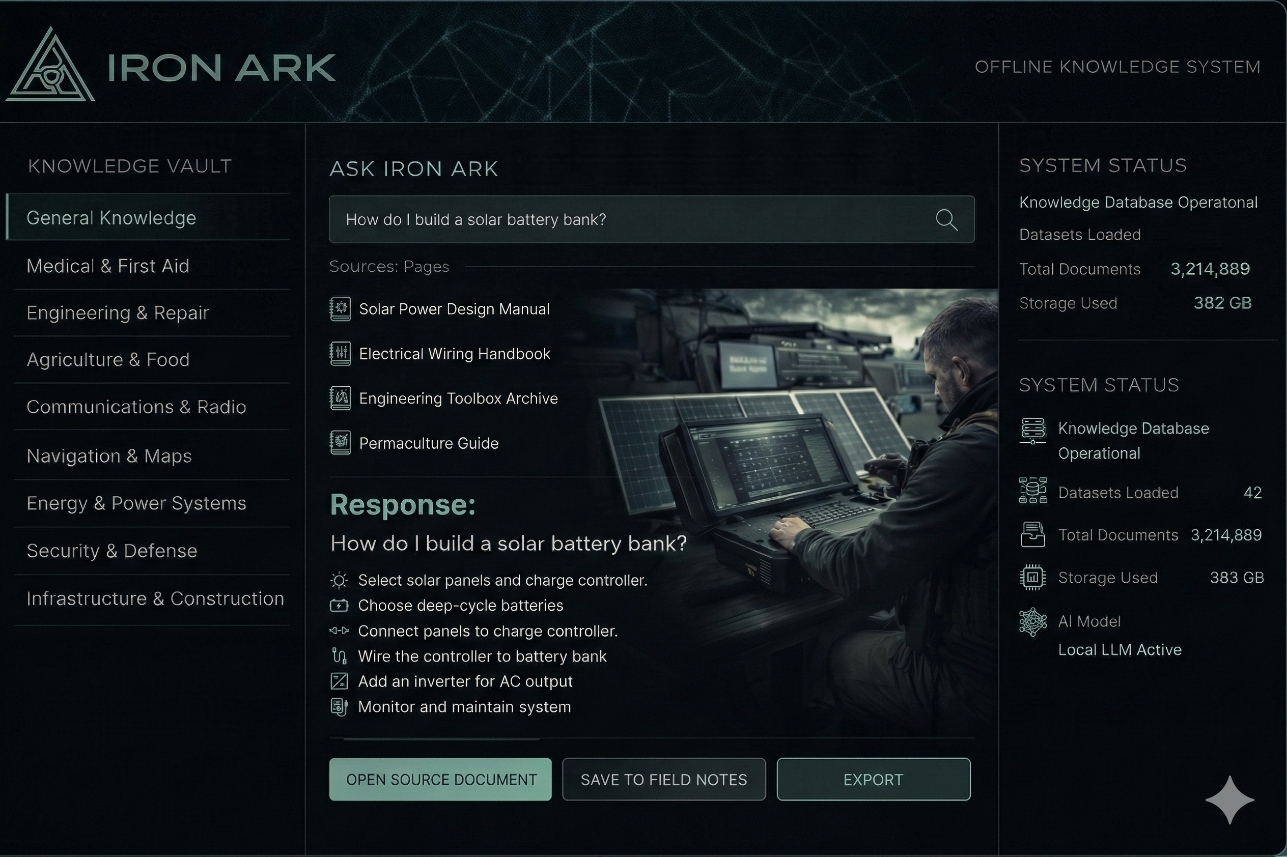 When the grid goes down, the manuals that once sat on library shelves and government servers are gone too. Iron Ark keeps them with you: offline, searchable, and AI-assisted. Permanently.